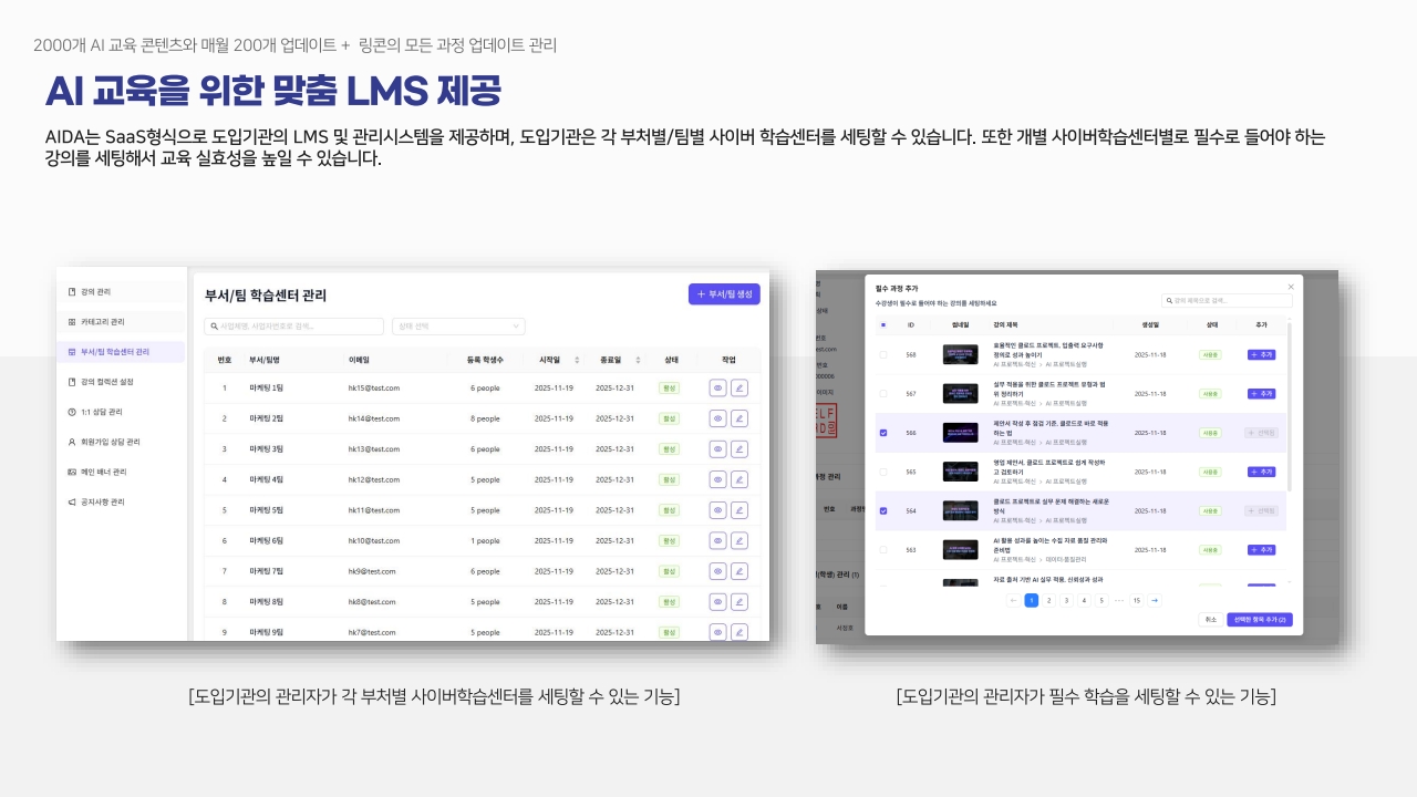 SaaS형식으로 각각 도입기관의 LMS 및 관리시스템을 제공하며, 도입기관은 기관의 방향성에 맞게 이러닝 사이트를 세팅하고, 관리할 수 있습니다.